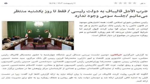 اردیبهشت ۱۴۰۳ وقتی چند روز از وعده صادق ۱ گذشته بود و قیمت دلار به ۷۰ هزارتومان رسید، علیرغم اینکه دولت توانست قیمت ارز را تا ۶۴ هزار تومان نیز کاهش دهد، قالیباف رئیس مجلس با اولتیماتوم به دولت شهید رئیسی تاکید کرد که باید برای نرخ ارز چاره اندیشی شود وگرنه برخورد مجلس متفاوت خواهد شد.